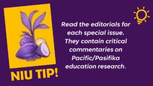 Three New Zealand-based journals have published special issues in Pacific education research, thus providing a platform to showcase research and build capacity and capability. They support Pacific/Pasifika academics with opportunities for publications for their PBRF portfolios (2012, 2018 rounds) critical commentaries on Pacific/Pasifika education research)